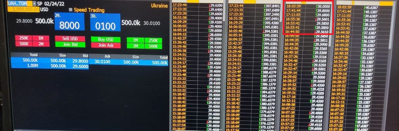 "Переполох на наличном валютном рынке спровоцировали не только новости о военном положении и ожидания по войне с РФ, но и резкий курсовой скачок на межбанке во время которого с безналичного рынка разом ушли все продавцы доллара и Нацбанк. НБУ не было не очень долго, но это спровоцировало панику. Первое, что сделали банки - подняли свои наличные курсы. Потом Национальный банк появился и продавал, но курсы в кассах уже закрепились и их не откатывали", - рассказал "Стране" директор казначейства крупного банка.
