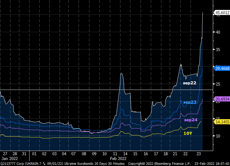 Вместе с курсом на новый исторический уровень подскочили и ставки по украинским еврооблигациям. Наши бонды с погашением в сентябре 2022 года поднялись с 26,35% на 45,6% годовых.