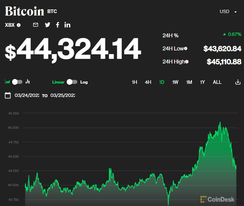 На данный момент, как указывается на сайте Coindesk, стоимость биткоина составляет 44 тысячи долларов за монету.