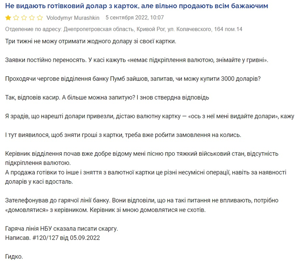 Большую пачку жалоб на невыдачу наличного доллара сформировали клиенты ПУМБа. Например, вкладчик из Днепра заявил об отказе выдать ему с валютной карточки не очень большой суммы — $1,7 тыс., невзирая на то, что он предварительно заказал эту сумму. Человек рассказал, что работники отделения ПУМБа (по пр. Дмитрия Яворницкого, 100) заявили ему, что наличного доллара нет по всему его городу. Однако клиент заверил, что это не правда.