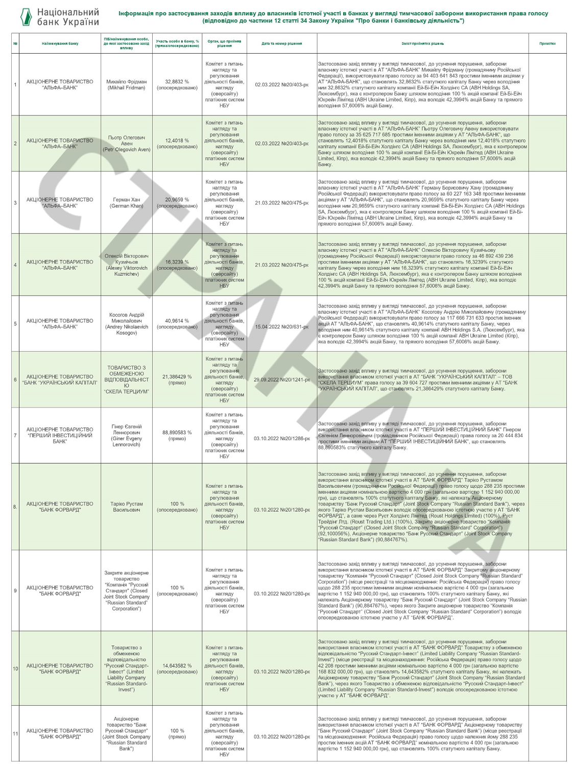 Во внутреннем письме НБУ не говорится о намерениях регулятора национализировать банки с подсанкционными акционерами или отобрать у них лицензий. Нацбанк пока лишь ограничил право голоса вышеперечисленным акционерам. Каким-то еще в марте 2022 году, каким-то - в апреле или в сентябре/октябре, данные можно найти в его отчете.