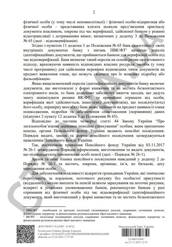 "Для обеспечения возможности открытия гражданам Украины, которые временно находятся за границей, текущего счета без личного присутствия (удаленно) с целью выплаты им пенсий путем зачисления на текущие счета, открытые в учреждениях уполномоченных банков, рекомендуем банкам в этом случае получение от физического лица во время видеоверификации идентификационного документа, изготовленного в форме книжечки и не содержащей бесконтактного электронного носителя, принимать пенсионное удостоверение как дополнительный документ", - говорится в документе Нацбанка.