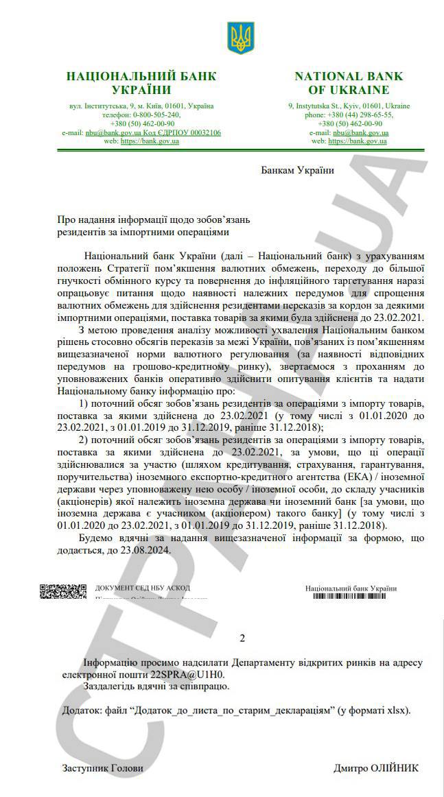 Из него понятно, что НБУ хочет рассчитать сумму валюты, которая может уйти из Украины за границу, если власти позволят бизнесу оплатить старые довоенные поставки импортных товаров. По-видимому, эти проплаты изначально застряли, и не были проведены после введения валютных ограничений 24 февраля 2022 года.
