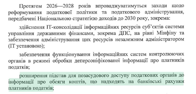 "В течение 2026-2028 годов будут внедряться меры по реформированию налоговой политики и налогового администрирования. В частности, расширение оснований для внесудебного доступа налоговых органов к информации об объемах средств, поступающих на банковские счета налогоплательщиков", - говорится в документе.
