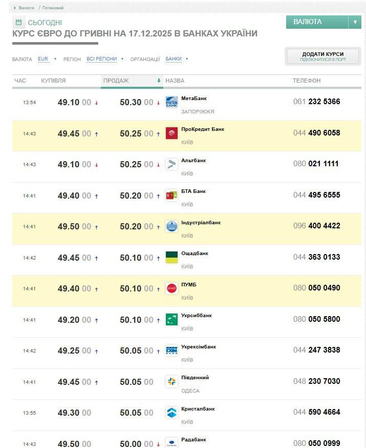 Сегодня максимальная цена на продаже евровалюты физлицам в кассах банков закрепилась на отметке 50,30 грн/€, её держит запорожский "МетаБанк". "ПроКредит Банк" с немецкими корнями ставит 50,25 грн/€, а государственный Ощадбанк — 50,10 грн/€. У другого розничного государственного "ПриватБанка" курс немного ниже — 49,95 грн/€, но покупатели жалуются на нехватку евробанкнот в отделениях.
