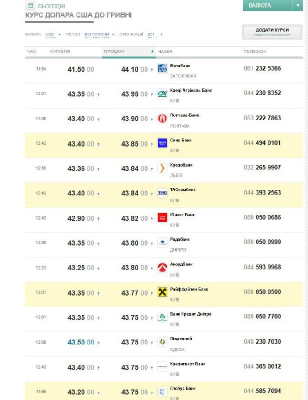 Резко, сразу на 30 копеек, подскочил и наличный курс американской валюты для населения. Максимальная цена продажи налички в кассах банков после обеда пробила новый психологический уровень и достигла 44,10 грн/$ (у "МетаБанка"), а средняя цена покупки/продажи оказалась в рамках 43,12-43,70 грн/$. Самый высокий карточный курс продажи ставил государственный "Сенс Банк" - 43,99 грн/$. В этом сегменте средний диапазон составил 43,17-43,59 грн/$.