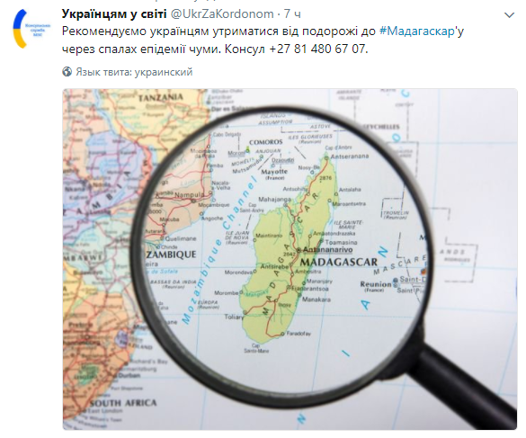 "Рекомендуем украинцам воздержаться от путешествия на Мадагаскар из-за вспышки эпидемии чумы", - сказано в нем.