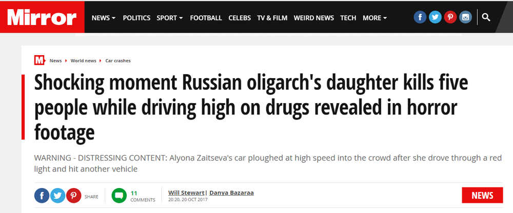 Британская газета Mirror в тексте про смертельное ДТП в Харькове назвала виновницу смертельного ДТП в Харькове Елену Зайцеву "дочерью русского олигарха".