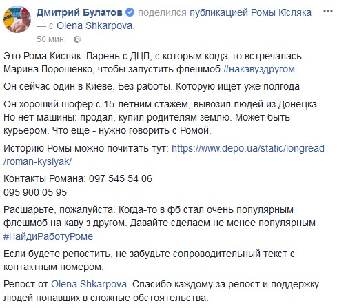 "Это Рома Кисляк. Парень с ДЦП, с которым когда-то встречалась Марина Порошенко, чтобы запустить флешмоб #накавуздругом. Он сейчас один в Киеве. Без работы. Которую ищет уже полгода", - написал он.