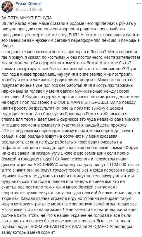 "Уже полгода без работы! Жил в хостелах, ходил по церквям просился в их гостиницы за деньги меня не берут. Полгода звоню в Фонд Марины Порошенко по поводу найти работу безрезультатно!", - написал он.