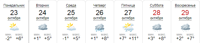 Сайт Sinoptik.ua обещает +5...+6 днем и -2...+1 в первые три дня недели. С четверга по воскресенье пойдут дожди и немного потеплеет до +7...+11 днем и +1...+3 ночью.