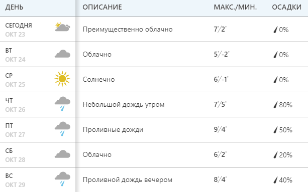Сайт Weather.com пишет, что в понедельник-четверг ожидается температура +5...+7 днем и -2...+5 ночью. Далее днем обещают +8...+9 и +2...+5 ночью. В четверг возможен дождь, в пятницу и воскресенье - проливной дождь.
