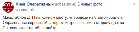 "Масштабное ДТП на Южном мосту: "паровоз" из 6 автомобилей. Образовался серьезный затор от метро Позняки в сторону центра", - говорится в сообщении.