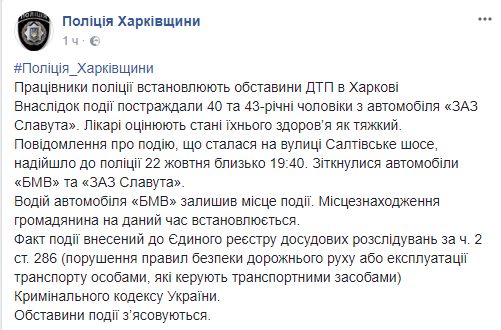 В полиции факт ДТП уже подтвердили. На странице местной полиции в Facebook сообщается, что действительно вчера вечером на Салтовском шоссе столкнулись автомобили BMW и "ЗАЗ Славута", тяжело пострадали два человека - 40 и 43-летние мужчины из автомобиля "ЗАЗ".