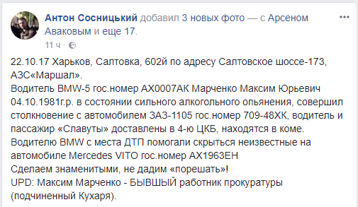 Сосницкий утверждает, что Марченко с места ДТП помогали скрыться неизвестные на автомобиле Mercedes VITO гос.номер АХ1963ЕН.