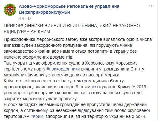 Херсонский отряд ГПСУ обнаружил у одного иностранца механическую подчистку установочных данных в паспорте моряка, а у другого члена экипажа, тоже гражданина Египта, в паспорте были 6 штампов, поставленных российскими пограничниками в пунктах аннексированного Крыма.