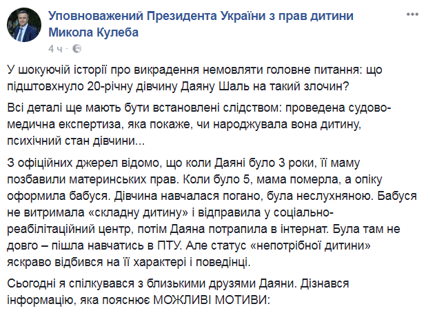 "Последние полтора года Даяна регулярно просила у знакомых крупные суммы денег (от 30 000 до 500 000 гривен) якобы себе на лечение от 4-х стадии рака. Девушка создавала закрытые сообщества в соц.сети для сбора средств себе «на лечение». В июле сообщила друзьям, что родила дочь с гидроцифалиею и ей также нужны деньги на лечение. Но в этой истории она постоянно путалась - рассказывала различную информацию о диагнозе, работу, семейное положение... Во время последнего разговора с подругой (сентябрь 2017) она сообщила, что взяла в долг 15 000 гривен на лечение дочери и постоянно находится с ней в реанимации. Но друзья сомневались в существовании этого ребенка. Их версия - похищение ребенка связано с потребностью в деньгах", - написал на Facebook-странице Уполномоченный Президента Украины по правам ребенка Николай Кулеба.