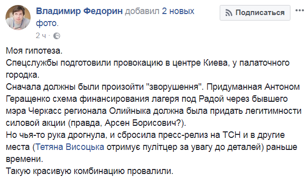 "Сначала должны были произойти "зворушення". Придуманная Антоном Геращенко схема финансирования лагеря под Радой через бывшего мэра Черкасс регионала Олийныка должна была придать легитимности силовой акции (правда, Арсен Борисович?).