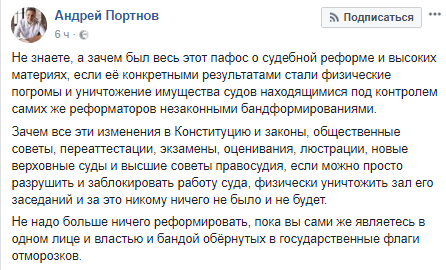 "Не знаете, а зачем был весь этот пафос о судебной реформе и высоких материях, если её конкретными результатами стали физические погромы и уничтожение имущества судов находящимися под контролем самих же реформаторов незаконными бандформированиями.