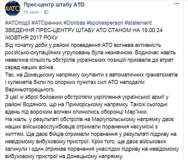 Во вторник, 24 октября 2017 на Донбассе погибли четверо украинских военных. Двое были убиты сепаратистскими обстрелами. Еще два военнослужащих погибли в результате двух случаев подрывов на неизвестных взрывных устройствах. Ранены по состоянию на 18:00 еще трое военнослужащих.