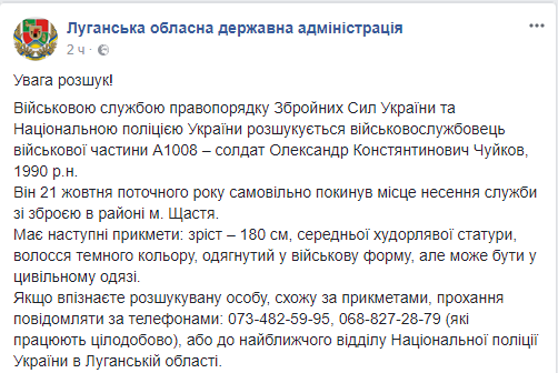 В Луганской области Военная служба правопорядка Вооруженных сил и Нацполиция объявили в розыск вооруженного дезертира. Об этом пресс-служба Луганской ОГА