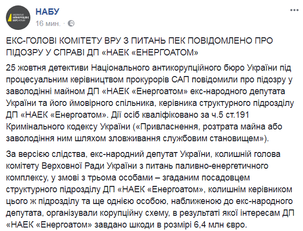 В среду, 25 октября детективы Национального антикоррупционного бюро Украины (НАБУ) под процессуальным руководством прокуроров САП сообщили экс-нардепу и его предполагаемому сообщнику о подозрении в завладении имуществом ГП "НАЭК" Энергоатом". Об этом вечером в среду сообщила пресс-служба НАБУ.