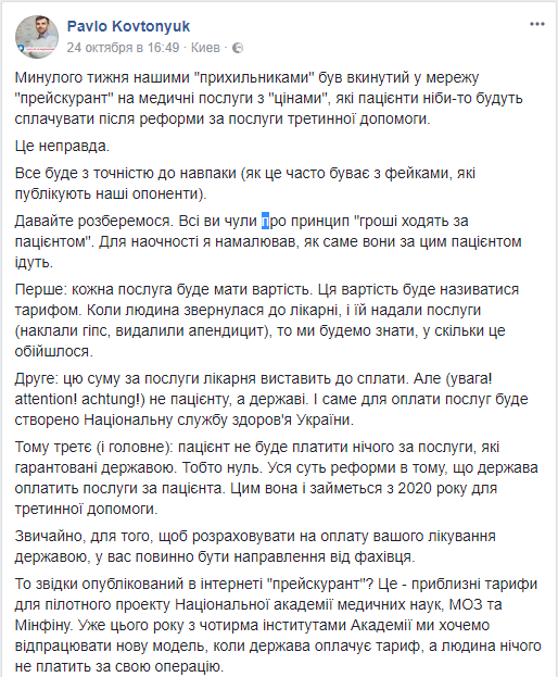 "Это - примерные тарифы для пилотного проекта Национальной академии медицинских наук, Минздрава и Минфина. Уже в этом году с четырьмя институтами Академии мы хотим отработать новую модель, когда государство оплачивает тариф, а человек ничего не платит за свою операцию", - пишет Ковтонюк в Facebook.
