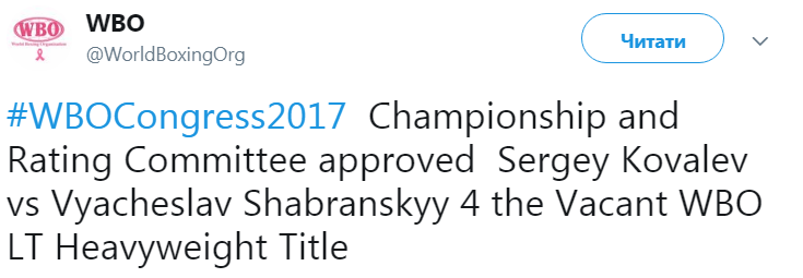 Об этом говорится на странице Всемирной боксерской организации WBO в микроблоге Twitter.