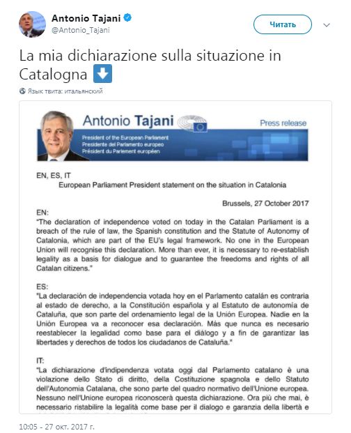"Декларация независимости, голосование по которой состоялось сегодня в парламенте Каталонии, противоречит верховенству закона, конституции Испании и уставу Каталонии, которые являются частью правовой системы Европейского союза. Никто в ЕС не признает эту декларацию. Сейчас как никогда необходимо восстановить законность в качестве основы для диалога и гарантировать свободу и права всех граждан Каталонии", - написал Таяни.