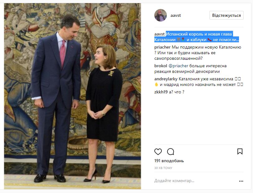 17:00 В Интернете опубликовано фото, на котором запечатлены король Испании Филипп VI и Сорайя Саэнс де Сантамария, которую накануне назначили главой Каталонии вместо мятежного Карлеса Пучдемона. На фото, которое опубликовал главный редактор "Эха Москвы" Алексей Венедиктов в своем Instagram, Сорайя на высоких шпильках не достает даже до плеча короля.