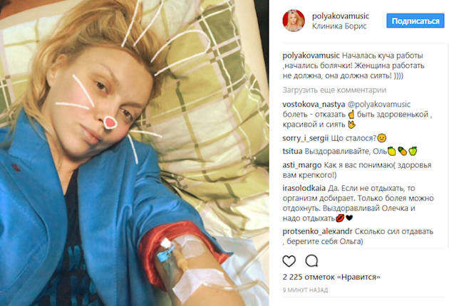 "Началась куча работы, начались болячки! Женщина работать не должна, она должна сиять", – написала Полякова, прикрепив свое фото из больницы.