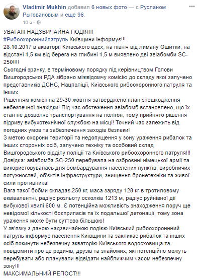 К северу от лимана Ошитки в Киевском водохранилище на расстоянии 1,5 км от берега и на глубине 1,5 метров обнаружены две авиационные бомбы SC-250. Об этом сообщил начальник Киевского рыбоохранного патруля Владимир Мухин на своей странице в Facebook.