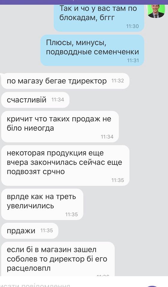 Другие блогеры начали приводить некие скрины переписки с "работником Рошен", который утверждает, что после блокады начался конфетный бум в магазинах президента.