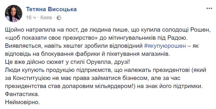 "Только что наткнулась на пост, где человек пишет, что купила сладости Рошен, "чтобы показать свое презрение" к митингующим под Радой. Оказывается, даже хэштег сделали соответствующий # якупуюрошен - как ответ на блокирование фабрики и пикетирование магазинов.