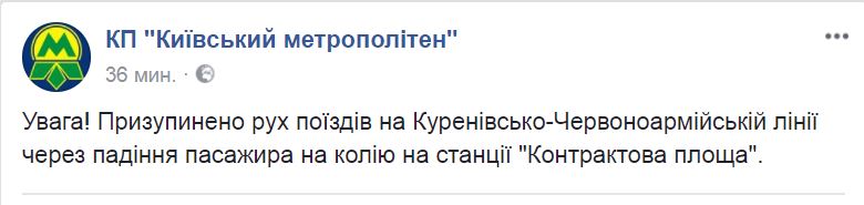 "Приостановлено движение поездов на Куреневско-Красноармейской линии из-за падения пассажира на рельсы на станции "Контрактовая площадь", - говорится в сообщении на странице метрополитена в Facebook.