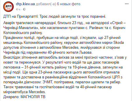 В результате ДТП на Прикарпатье три человека погибли и трое ранены. Об этом в Facebook сообщает dtp.kiev.ua.