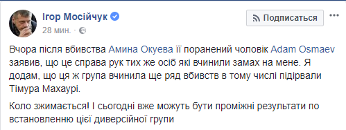 Раненый в результате теракта нардеп-радикал Игорь Мосийчук назвал убийство Амины Окуевой, Тимура Махаури и покушение на него делом рук одной диверсионной группы. Об этом он написал в Facebook.