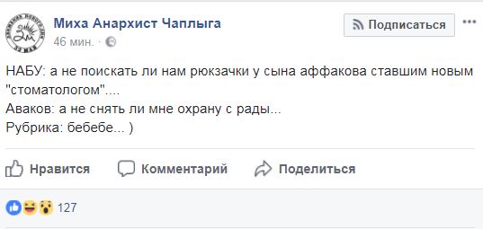 "НАБУ: а не поискать ли нам рюкзачки у сына аффакова... Аваков: а не снять ли мне охрану с рады...Рубрика: бебебе... )", - пишет Чаплыга.