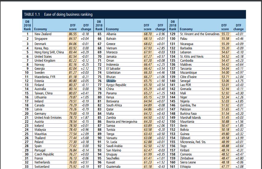 В ежегодном рейтинге Doing Business – 2018 (составляется группой Всемирного банка) Украина поднялась на 4 позиции среди 190 стран и заняла 76 место.