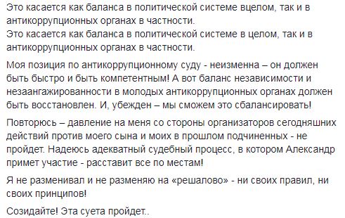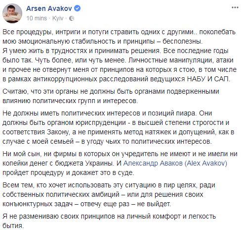 "Ни мой сын, ни фирмы в которых он учредитель не имеют и не имели ни копейки денег с бюджета Украины. И Александр Аваков (Alex Avakov)пройдет процедуру и докажет это в суде. Всем тем, кто хочет использовать эту ситуацию в пир целях, ради собственных политических амбиций – или для решения своих конъюнктурных задач – отвечу еще раз – не выйдет. Я не размениваю своих принципов на личный комфорт и легкость бытия", - написал он.