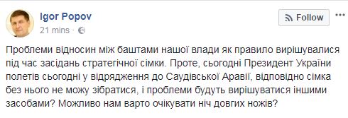 "Проблемы отношений между башнями нашей власти обычно решались во время заседаний стратегической семерки. Однако, сегодня президент Украины полетел в командировку в Саудовскую Аравию. И, соответственно, семерка без него не может собраться. И проблемы будут решаться другими средствами? Возможно нам стоит ожидать ночь длинных ножей?", - написал Попов.