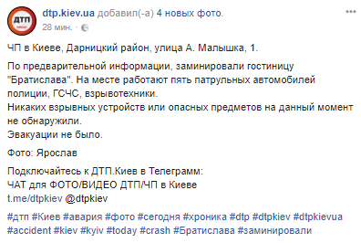 В Киеве неизвестные заминировали гостиницу "Братислава" возле станции метро Дарница по улице А. Малышко, 1. Об этом сообщает dtp.kiev.ua на своей странице в Facebook.