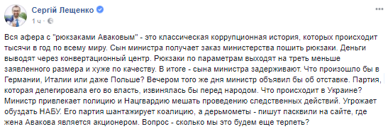 "Вся афера с "рюкзаками Аваковым" - это классическая коррупционная история, которых происходит тысячи в год по всему миру. Сын министра получает заказ министерства пошить рюкзаки. Деньги выводят через конвертационный центр. Рюкзаки по параметрам выходят на треть меньше заявленного размера и хуже по качеству. В итоге - сына министра задерживают. Что произошло бы в Германии, Италии или даже Польше? Вечером того же дня министр объявил бы об отставке. Партия, которая делегировала его во власть, извинялась бы перед народом. Что происходит в Украине? Министр привлекает полицию и Нацгвардию мешать проведению следственных действий. Угрожает обуздать НАБУ. Его партия шантажирует коалицию, а дерьмометы - пишут пасквили на сайте, где жена Авакова является акционером. Вопрос - сколько мы это будем еще терпеть?", - сообщил он на своей странице в соцсети.