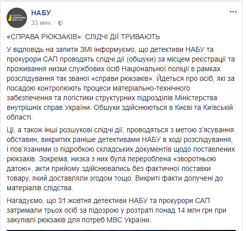 "В ответ на запросы СМИ информируем, что детективы НАБУ и прокуроры САП проводят следственные действия (обыски) по месту регистрации и проживания ряда должностных лиц Национальной полиции в рамках расследования так называемого" дела рюкзаков", - говорится в сообщении.