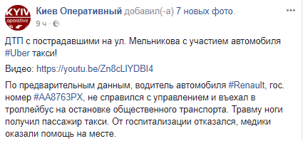 В Киеве произошло ДТП с участием такси Uber и троллейбуса. Об этом в Facebook сообщает "Киев Оперативный".