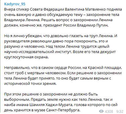 "Я лично убежден, что довольно глазеть на труп Ленина. И руководителя революции давно пора похоронить, это и разумно, и человечно", - написал Кадыров.
