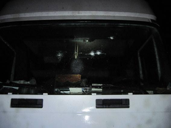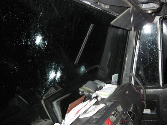 В этот момент возле аварийного грузовика остановилась легковушка, из которой выскочили четверо мужчин в масках и с пистолетом – они сделали несколько выстрелов по кабине, чтобы запугать своих жертв.