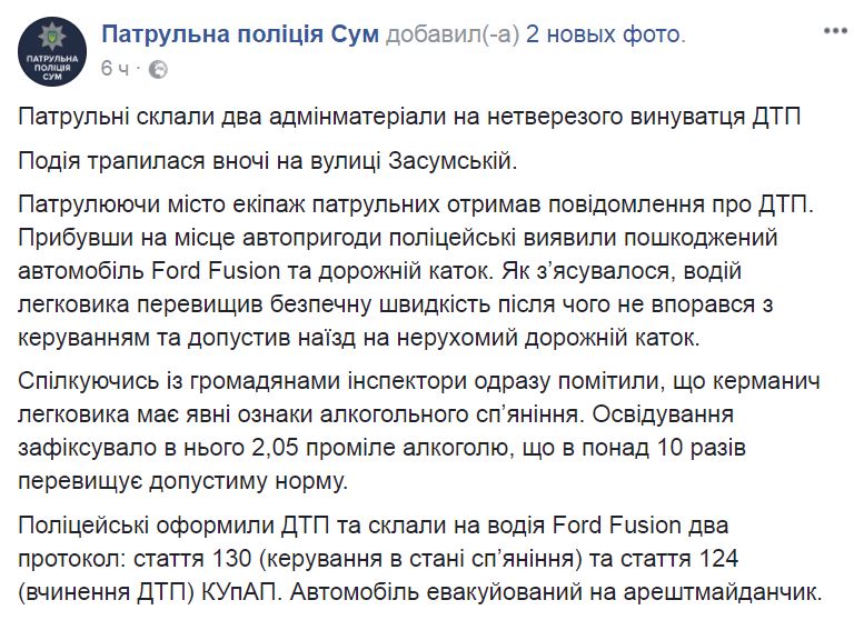 В Сумах нетрезвый водитель протаранил дорожный каток. Об этом сообщает патрульная полиция города в Facebook.