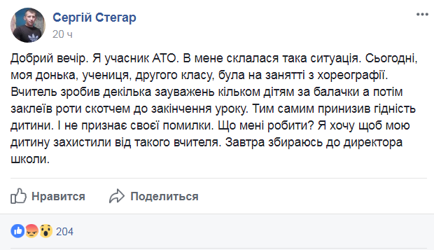 "Я участник АТО. У меня сложилась такая ситуация. Сегодня, моя дочь, ученица второго класса, была на занятии по хореографии. Учитель сделал несколько замечаний нескольким детям за слова а потом заклеил рты скотчем до окончания урока. Тем самым унизил достоинство ребенка. И не признает своей ошибки. Что мне делать? Я хочу, чтобы моего ребенка защитили от такого учителя. Завтра собираюсь к директору школы ", - написал отец пострадавшего ребенка в четверг, 2 ноября.