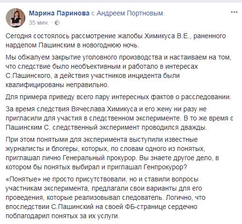 "Сегодня состоялось рассмотрение жалобы Химикуса В.Е., раненного нардепом Пашинским в новогоднюю ночь. Мы обжалуем закрытие уголовного производства и настаиваем на том, что следствие было необъективным и работало в интересах С.Пашинского, а действия участников инцидента были квалифицированы неправильно", - написала она.